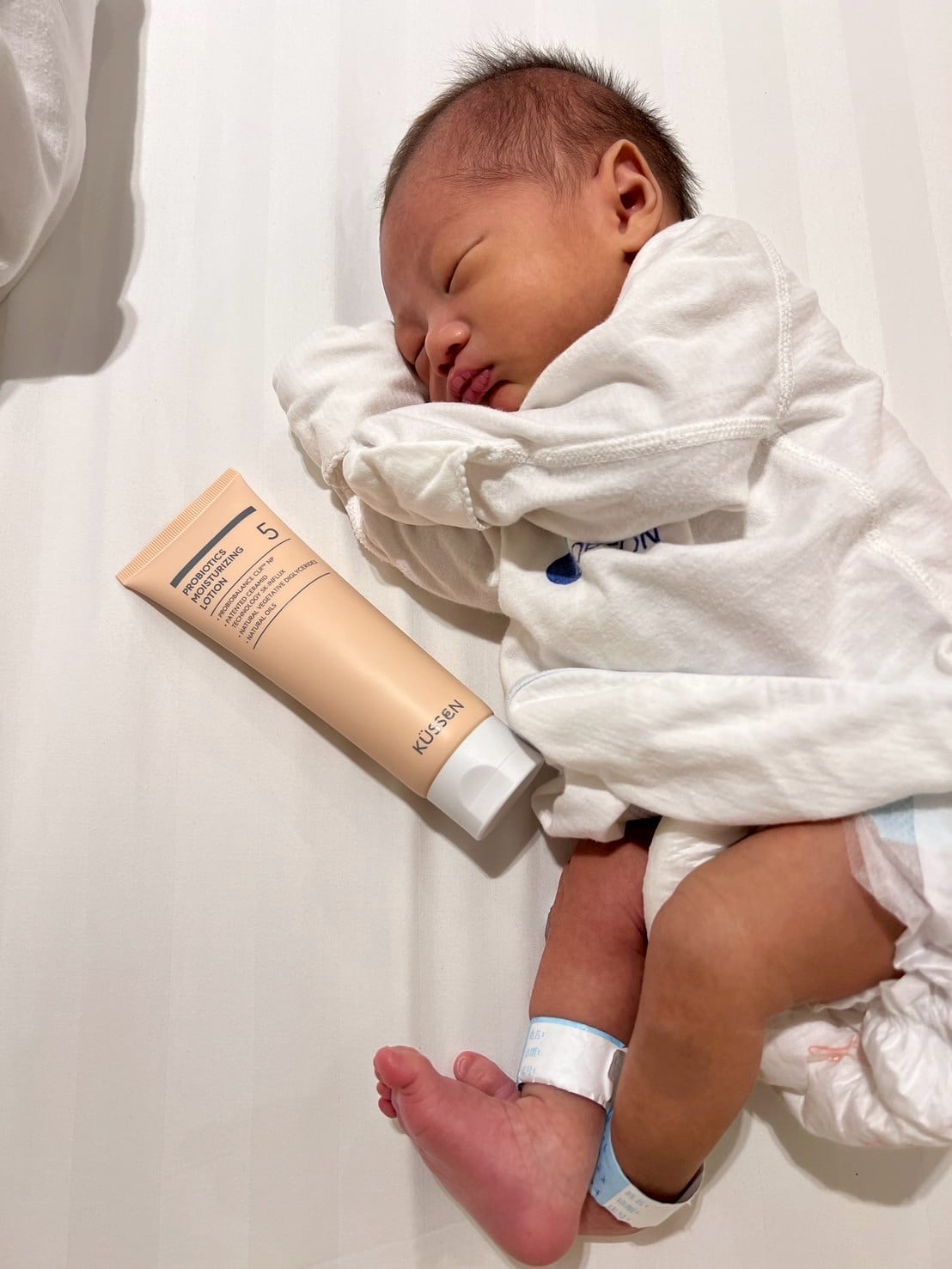 後來我趕快買葵森的乳液+潤膚油給他,整個膚況好轉很多,因為這罐成分很單純、完全無香精,又有益生菌跟神經醯胺修護,溫和又很有效。我朋友幫他擦了大概兩三週後跟我說:「他臉終於沒那麼容易突然紅起來了。」現在他們也是早晚固定擦,尤其洗澡後都不敢漏掉。真的不是每一罐乳液都適合異膚寶寶,找到一罐能穩定膚況、不刺激、又能天天擦的,才是真的救星